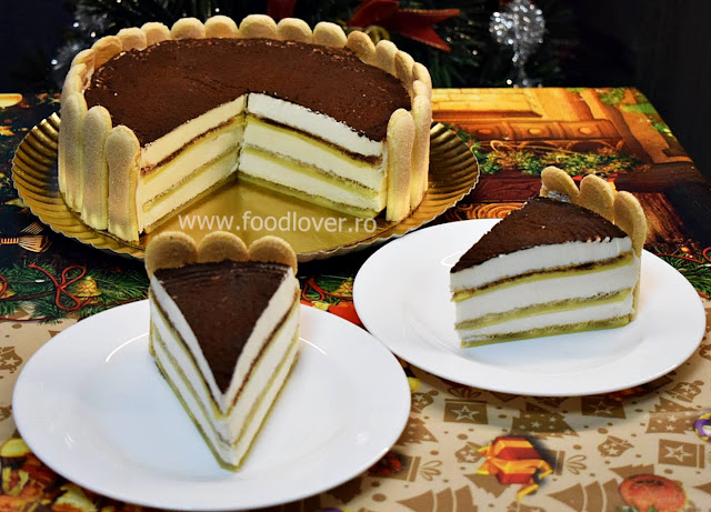 4. Asamblarea: fiecare blat se insiropeaza cu cafeaua instant. O tava cu fund detasabil se tapeteaza cu forma rotunda din carton pentru tort, iar marginile cu folie acetofan. Se aseaza primul blat insiropat, crema, al doilea blat insiropat, crema, al treila blat insiropat, crema. Cu ajutorul unei furculite se creeaza valuri, dupa care se pudreaza suprafata cu cacao. Cu restul de crema se imbraca marginile, se lipesc jumatatile de piscoturi de jur imprejur si se baga la rece pana a 2a zi. Se poate lasa asa cum este sau se orneaza dupa preferinte. Eu am ales o imagine comestibila cu motiv specific sfarsitului de an.
